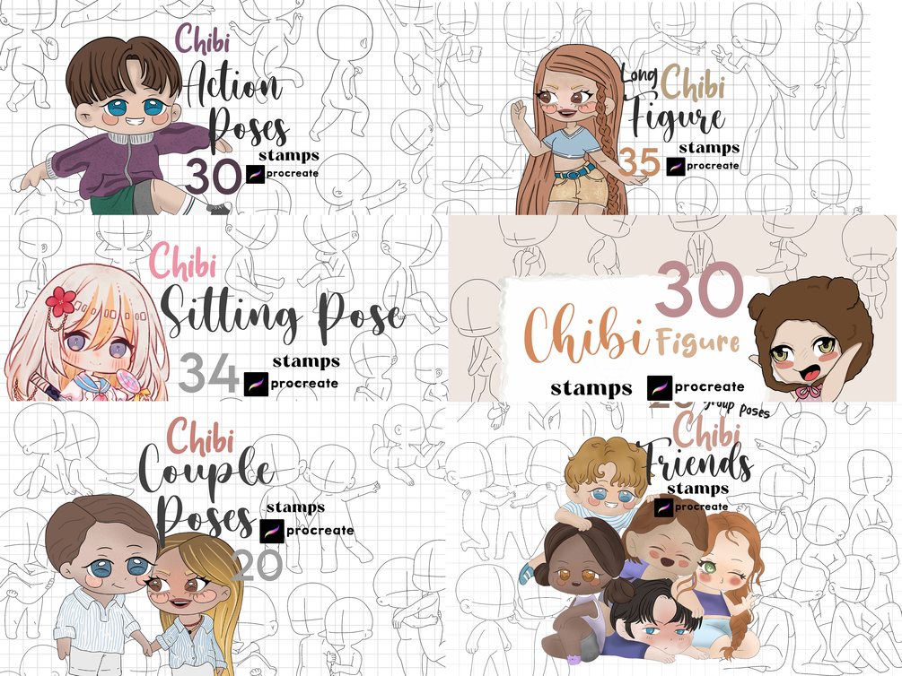 Full Pack of hand drawn chibi pose procreate stamp brushes! These are perfect for adding to your cartoon, anime, kawaii, mix and match or other illustration projects. You can use these in any color or opacity, and they can be resized to best fit your art.