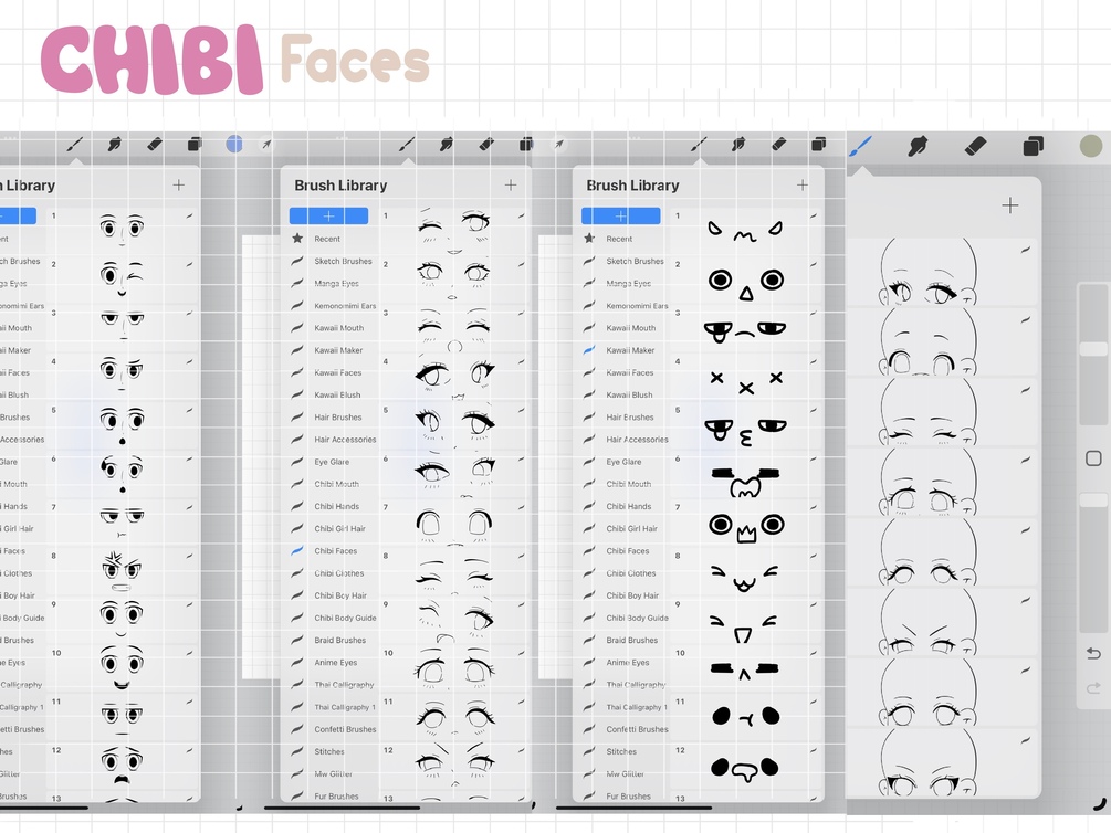 Set of 1500+ hand drawn chibi face procreate stamp brushes! These are perfect for adding to your cartoon, anime, kawaii, mix and match or other illustration projects. You can use these in any color or opacity, and they can be resized to best fit your art.