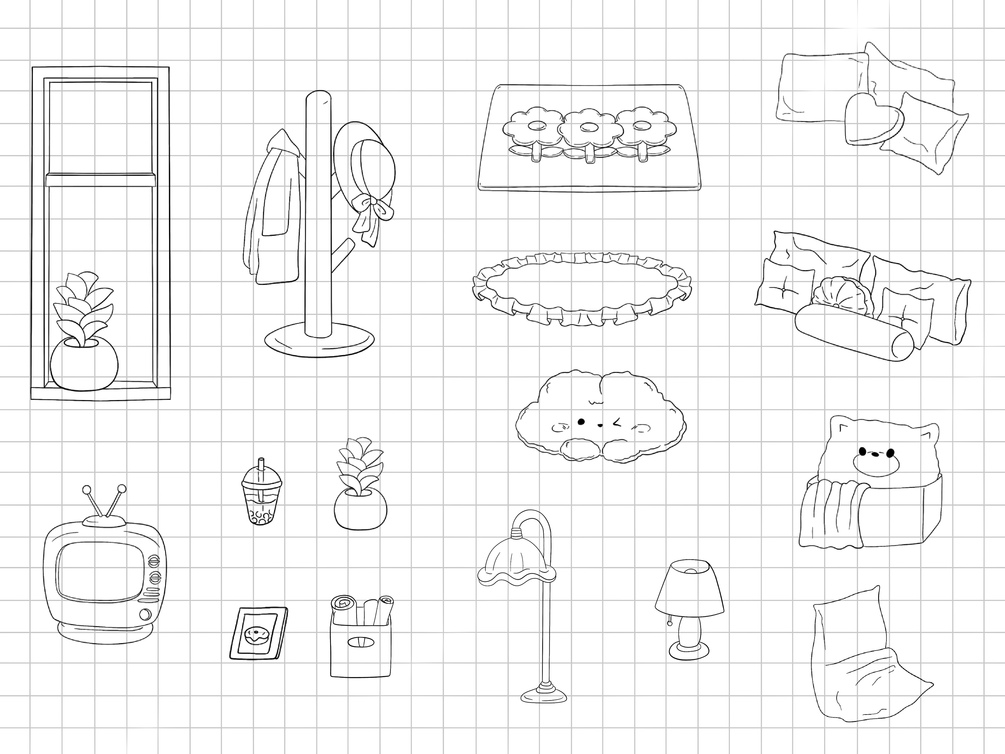 Set of 70 hand drawn Kawaii interior accessories procreate stamp brushes! These are perfect for adding to your cartoon, anime, kawaii, manga, mix and match or other illustration projects. You can use these in any color or opacity, and they can be resized to best fit your art.