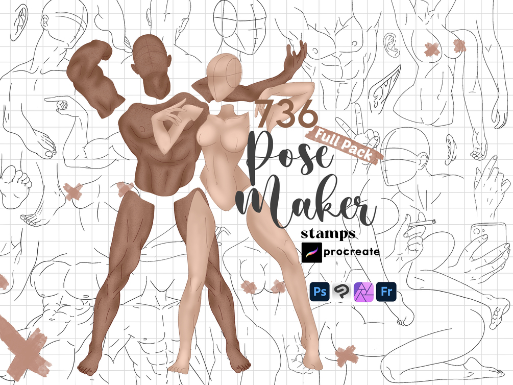 Full Pack of 736 hand drawn body pose maker procreate stamp brushes!